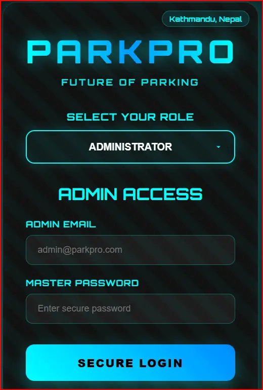 Similar to parking systems, this login design uses dropdown selection to manage different roles such as staff, admin, or users. It simplifies authentication while improving system organization.