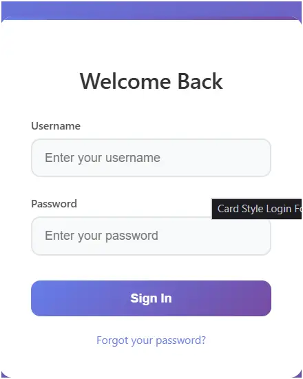 - Card Design UI – The login form is displayed inside a card with rounded corners, shadows, and a gradient header effect.