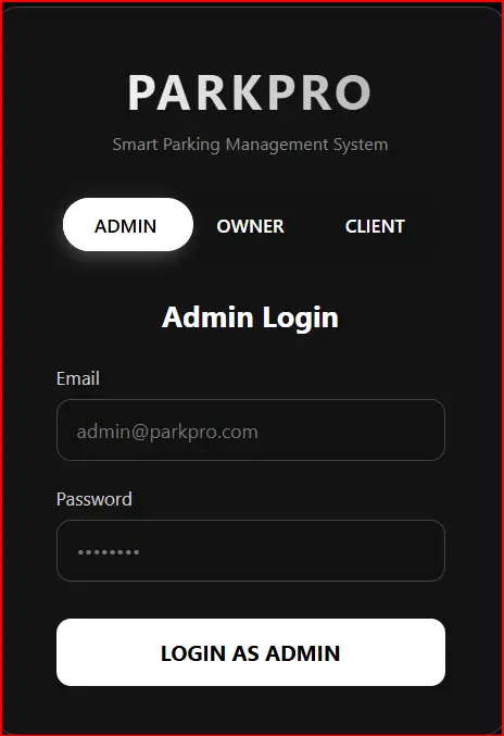 <!DOCTYPE html> <html lang="en"> <head> <meta charset="UTF-8"> <meta name="viewport" content="width=device-width, initial-scale=1.0"> <title>Parking System - Login & Register</title> <style> :root { --bg: #000; --text: #fff; --accent: #fff; --input-bg: #111; --border: #444; --error: #ff3333; --success: #00ff00; } * { margin: 0; padding: 0; box-sizing: border-box; font-family: 'Segoe UI', sans-serif; } body { background: var(--bg); color: var(--text); min-height: 100vh; display: flex; align-items: center; justify-content: center; padding: 20px; } .container { background: rgba(20, 20, 20, 0.95); padding: 40px 50px; border-radius: 20px; box-shadow: 0 0 40px rgba(255, 255, 255, 0.1); width: 100%; max-width: 420px; border: 1px solid var(--border); position: relative; overflow: hidden; } .logo { text-align: center; margin-bottom: 30px; } .logo h1 { font-size: 2.5rem; letter-spacing: 3px; background: linear-gradient(90deg, #fff, #aaa); -webkit-background-clip: text; -webkit-text-fill-color: transparent; } .logo p { color: #888; font-size: 0.9rem; margin-top: 8px; } .toggle-switch { display: flex; background: var(--input-bg); border-radius: 50px; padding: 6px; margin-bottom: 30px; position: relative; } .toggle-btn { flex: 1; padding48px; padding: 12px; text-align: center; cursor: pointer; border-radius: 50px; transition: all 0.4s ease; z-index: 2; font-weight: 600; font-size: 0.95rem; } .toggle-btn.active { background: #fff; color: #000; box-shadow: 0 4px 15px rgba(255, 255, 255, 0.3); } .slider { position: absolute; top: 6px; left: 6px; width: 33.33%; height: calc(100% - 12px); background: #fff; border-radius: 50px; transition: all 0.4s ease; box-shadow: 0 4px 20px rgba(0,0,0,0.4); } .form-container { position: relative; } .form-group { margin-bottom: 20px; position: relative; } label { display: block; margin-bottom: 8px; font-size: 0.95rem; color: #ccc; } input { width: 100%; padding: 14px 16px; background: var(--input-bg); border: 1px solid var(--border); border-radius: 12px; color: #fff; font-size: 1rem; transition: all 0.3s ease; } input:focus { outline: none; border-color: #fff; box-shadow: 0 0 0 3px rgba(255, 255, 255, 0.1); } .password-requirements { font-size: 0.8rem; color: #888; margin-top: 8px; line-height: 1.4; } .error { color: var(--error); font-size: 0.85rem; margin-top: 6px; display: none; } .success { color: var(--success); font-size: 0.85rem; margin-top: 6px; display: none; } button { width: 100%; padding: 16px; background: #fff; color: #000; border: none; border-radius: 12px; font-size: 1.1rem; font-weight: 700; cursor: pointer; transition: all 0.3s ease; margin-top: 10px; } button:hover { background: #eee; transform: translateY(-2px); } .switch-text { text-align: center; margin-top: 25px; color: #aaa; font-size: 0.9rem; } .switch-text a { color: #fff; text-decoration: none; font-weight: 600; } .switch-text a:hover { text-decoration: underline; } /* Form visibility */ .form-section { display: none; opacity: 0; transition: all 0.4s ease; } .form-section.active { display: block; opacity: 1; } @media (max-width: 480px) { .container { padding: 30px 25px; } .logo h1 { font-size: 2rem; } } </style> </head> <body> <div class="container"> <div class="logo"> <h1>PARKPRO</h1> <p>Smart Parking Management System</p> </div> <!-- Role Toggle Switch --> <div class="toggle-switch"> <div class="toggle-btn active" data-role="admin">ADMIN</div> <div class="toggle-btn" data-role="owner">OWNER</div> <div class="toggle-btn" data-role="client">CLIENT</div> <div class="slider"></div> </div> <div class="form-container"> <!-- Admin Login --> <div id="admin-form" class="form-section active"> <h2 style="text-align:center; margin-bottom:25px; color:#fff;">Admin Login</h2> <div class="form-group"> <label>Email</label> <input type="email" id="admin-email" placeholder="[email protected]" required> <div class="error" id="admin-email-error"></div> </div> <div class="form-group"> <label>Password</label> <input type="password" id="admin-password" placeholder="••••••••" required> <div class="error" id="admin-pass-error"></div> </div> <button onclick="adminLogin()">LOGIN AS ADMIN</button> <div class="success" id="admin-success"></div> </div> <!-- Owner Register/Login --> <div id="owner-form" class="form-section"> <h2 style="text-align:center; margin-bottom:25px; color:#fff;">Owner Portal</h2> <div class="form-group"> <label>Full Name</label> <input type="text" id="owner-name" placeholder="John Doe"> <div class="error" id="owner-name-error"></div> </div> <div class="form-group"> <label>Email</label> <input type="email" id="owner-email" placeholder="[email protected]"> <div class="error" id="owner-email-error"></div> </div> <div class="form-group"> <label>Password</label> <input type="password" id="owner-password" placeholder="••••••••"> <div class="error" id="owner-pass-error"></div> <div class="password-requirements"> Password must contain:<br> • At least 8 characters<br> • 1 uppercase, 1 lowercase<br> • 1 number & 1 symbol (!@#$%^&*) </div> </div> <div class="form-group"> <label>Parking Name</label> <input type="text" id="owner-parking" placeholder="Downtown Parking Lot"> <div class="error" id="owner-parking-error"></div> </div> <button onclick="ownerRegister()">REGISTER AS OWNER</button> <div class="switch-text"> Already have an account? <a href="#" onclick="switchToLogin('owner')">Login here</a> </div> <div class="success" id="owner-success"></div> </div> <!-- Client Register/Login --> <div id="client-form" class="form-section"> <h2 style="text-align:center; margin-bottom:25px; color:#fff;">Client Portal</h2> <div class="form-group"> <label>Full Name</label> <input type="text" id="client-name" placeholder="Jane Smith"> <div class="error" id="client-name-error"></div> </div> <div class="form-group"> <label>Email</label> <input type="email" id="client-email" placeholder="[email protected]"> <div class="error" id="client-email-error"></div> </div> <div class="form-group"> <la